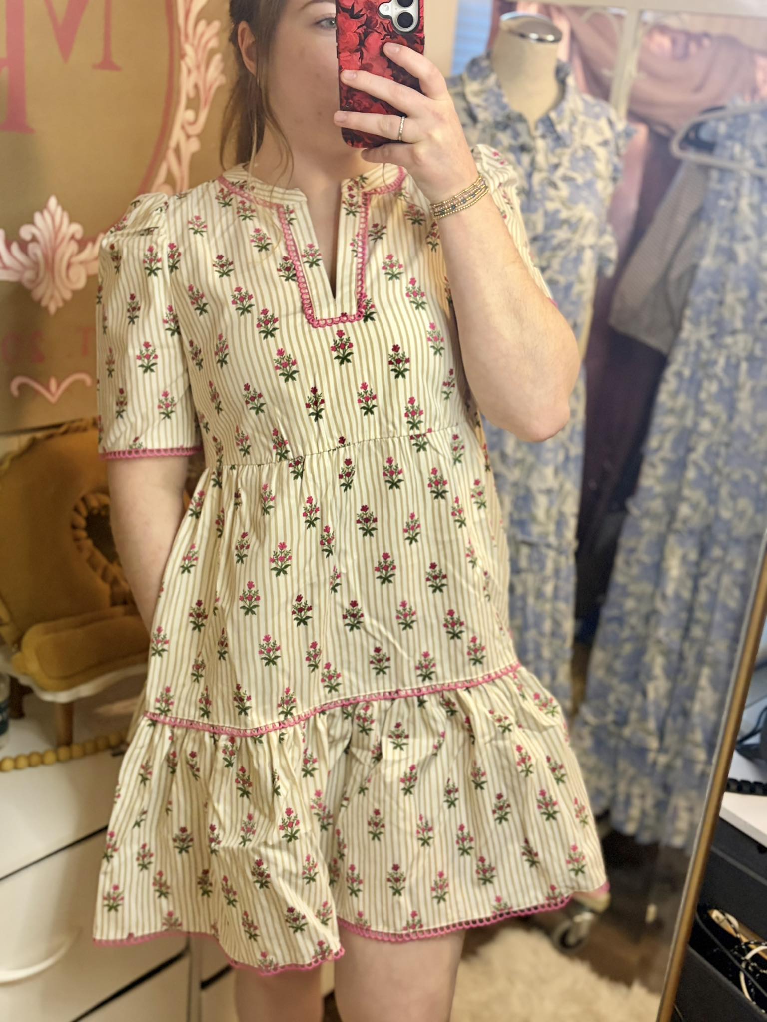 The perfect spring dress for a day out! The fitted silhouette features pockets, a v-neck style bust, a flared hem and scallop hem details. The dress fits true to size. Fabric content: 100% polyester. Non see-through.